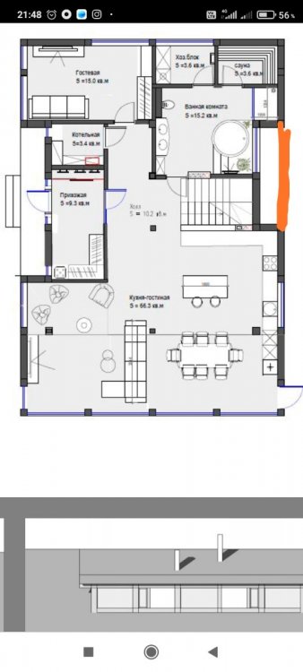 Друзья, как вы знаете мы уже сделали один проект дома на 85 м2 совместными усилиями, который сейчас доступен всем. Как показала практика, одноэтажные фахверки менее популярны, и большинство наших форумчан собираются строить 2 этажа с площадь дома 170+ м2. Ранее мы с вами уже определили некоторые критерии нового проекта, а именно: потолок 1го этажа не менее 2700 мм в чистоте, площадь 200+, толщина стен 240 мм. В процессе обсуждения мы нашли подходящий существующий проект дома, внешний вид которого может быть ориентиром для нового проекта: https://hi-dom.com/project?id=24 Мы предлагаем в этом доме сделать некоторые изменения, а именно: - убрать балкон и свесы и адаптировать свесы кровли над ним (сделать короче) - сделать сплошной одну из стен первого этажа, как на рисунке - минимизировать прерывистость наружной отделки на стороне дома с балконом (бывшим) путём сокращения количества стоек или уменьшения их толщины так, чтобы стойки остались под наружной отделкой в пироге стены Вы готовы?
